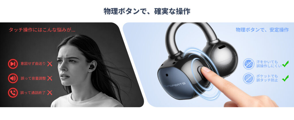 タッチ式との最大の違いは、押した瞬間の確実なフィードバックです。ランニング中に汗をふこうとして、意図せず触れても誤作動しません。毎日使う中で「意図せず音量が変わった」「曲が飛んだ」というストレスが起きにくい点の価値は、使えば使うほど実感できます。