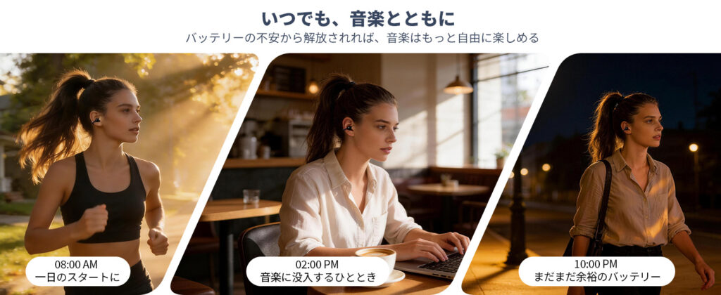 長時間の作業用や移動中のながら聴きでは、AACまたはSBC接続で使うとバッテリーを長持ちさせやすくなります。BGMとして流し続ける用途なら、音質設定を盛りすぎないほうが実用的です。