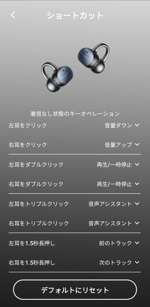 UU2イヤーカフはタッチセンサーではなく物理ボタンを採用しています。左右それぞれにボタンが配置されており、シングルクリック・ダブルクリック・トリプルクリック・長押しで再生・停止・曲送り・音量調整・通話応答などを割り当てられます。