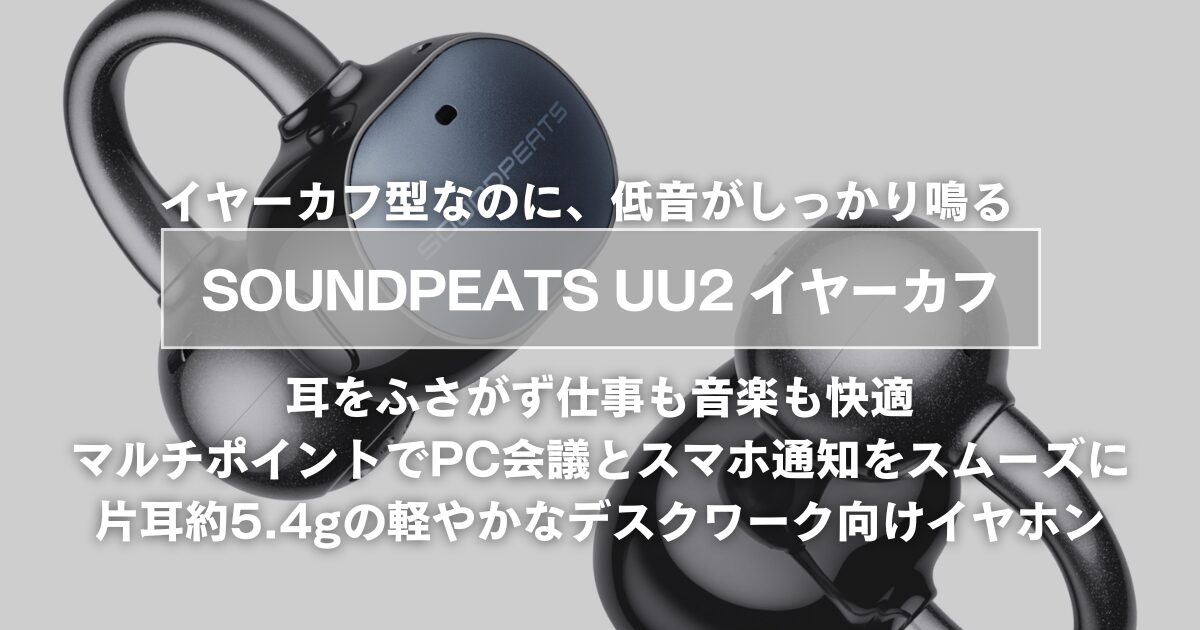 「耳を塞がないのに、低音が出る」というのは、もはやSOUNDPEATSのイヤーカフシリーズの看板文句になりつつあります。2026年4月20日に発売されたUU2イヤーカフは、そのコンセプトをさらに一段押し進めた最新モデルです。前モデル比で音圧を約3.2dB引き上げ、バッテリーを単体10時間・ケース込み42時間まで伸ばし、Bluetooth 6.0を搭載して接続安定性も向上しています。価格は7,280円。