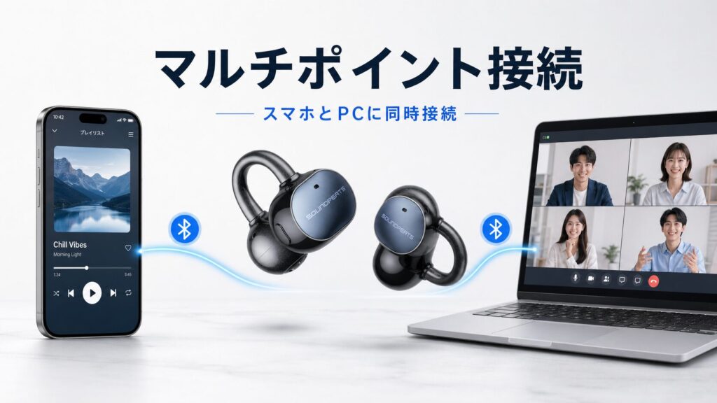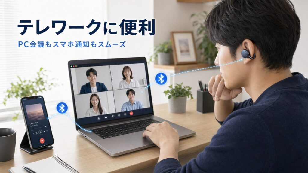 スマートフォンとPCを同時接続できるマルチポイントに対応しています。デスクワーク中にPCで音楽を聴きながら、スマートフォンへの電話着信に自動で切り替わる使い方が特に実用的です。