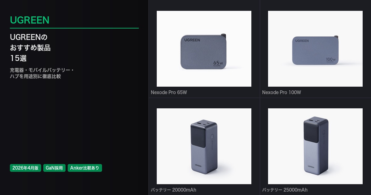 UGREENは中国深センの上場ブランドで、2025年ごろから日本のAmazon売れ筋に充電器・モバイルバッテリーを送り込み、Anker一強だった市場に明確な対抗軸を作りました。コスパが評価の中心にあるのは確かですが、GaN IIIチップや独自の放熱設計など技術的な競争力も伴っています。